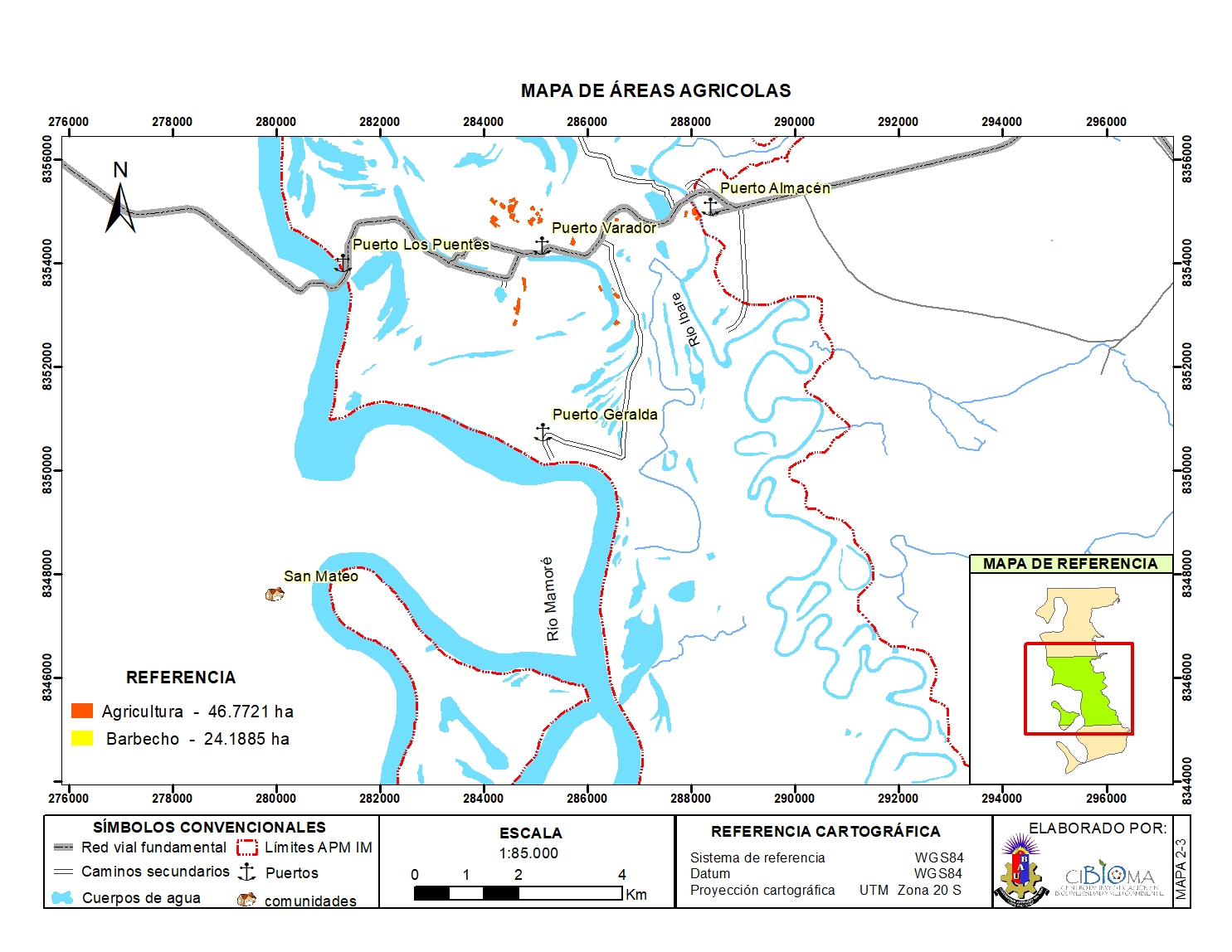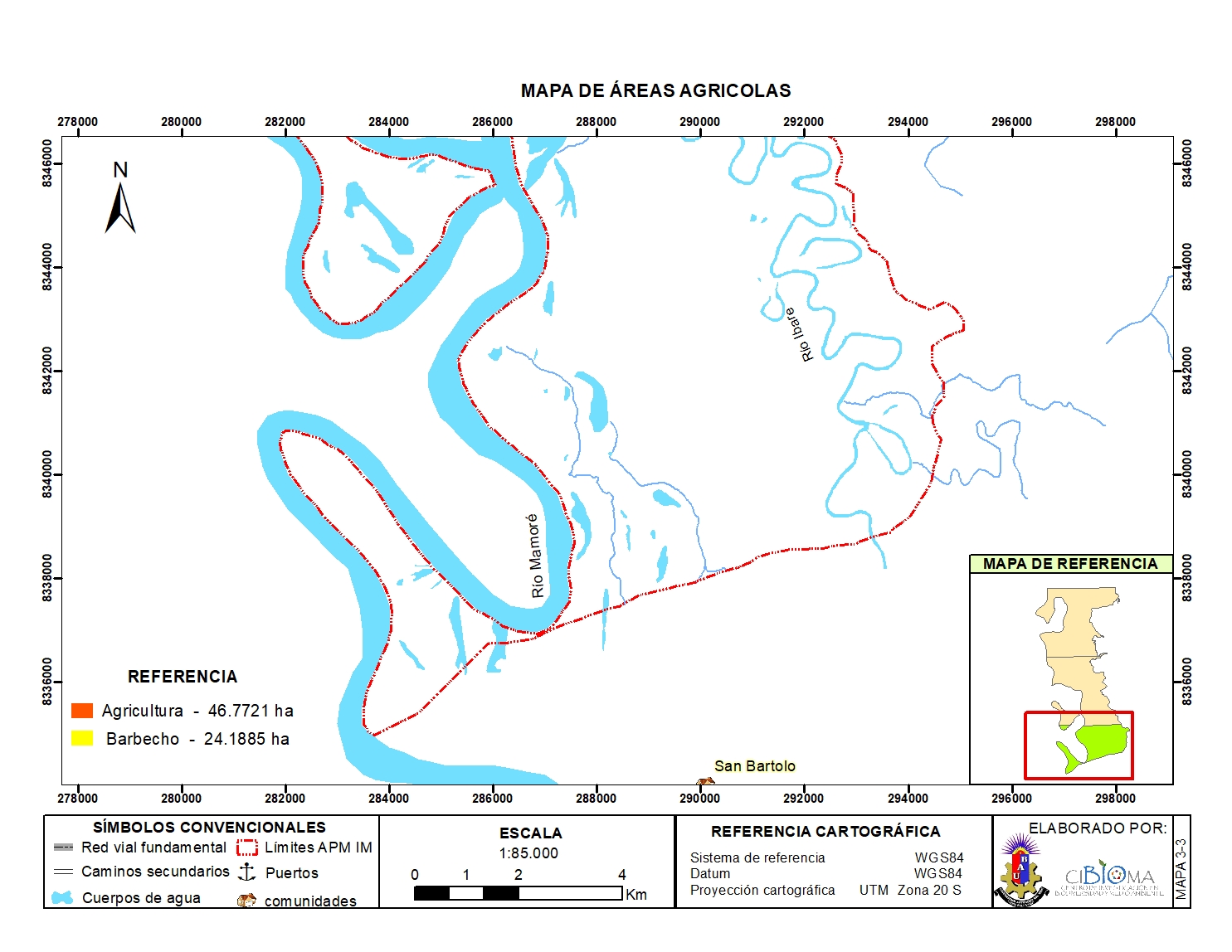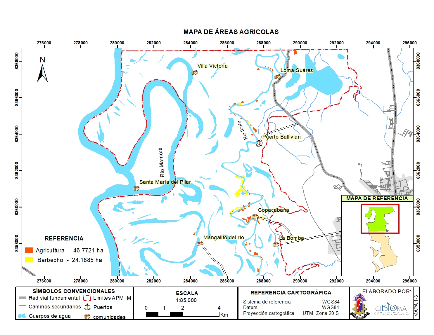 Ilustra áreas donde se practica agricultura permanente y de barbecho y muestra el total de estas en hectáreas, dentro de la Área Protegida Municipal Ibare Mamoré (APM IM), para la mejor visualización el mapa está dividido en tres partes.