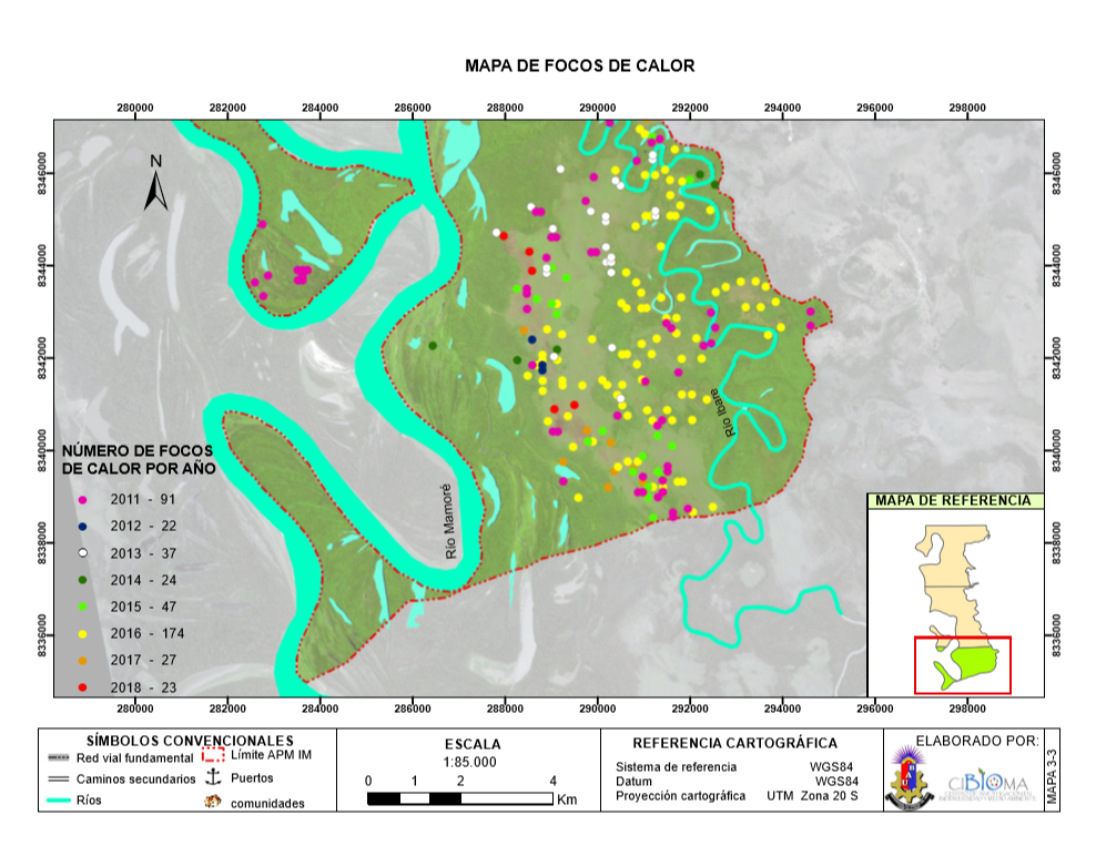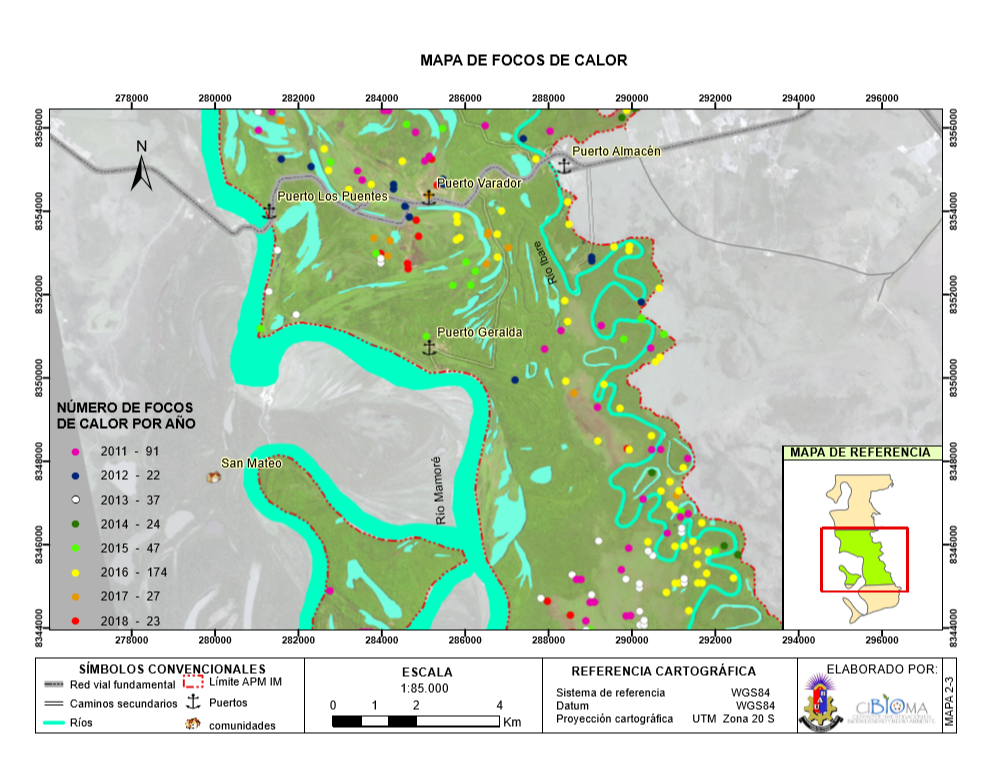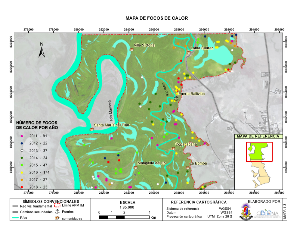 Refleja la distribución espacial del número de focos de calor presentes por año dentro del APM Ibare Mamoré, para mejor visualización el mapa se divide en 3 partes.